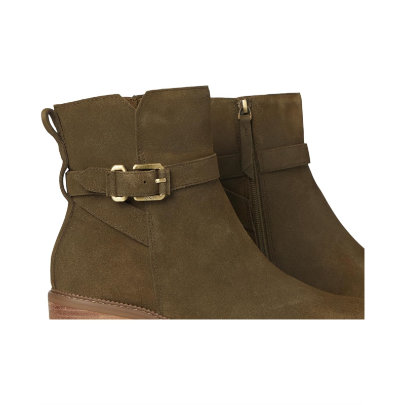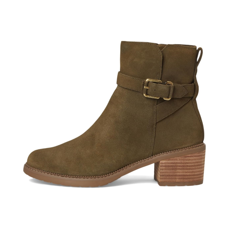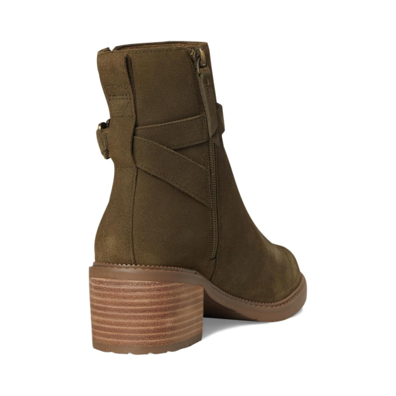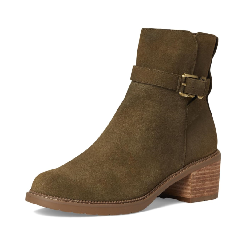 - The TOMS Hailey Buckle boots are block-heeled boots with a mini lugged rubber outsole and buckle hardware. Their medial zipper ensures easy on and off. These calf-high boots are made of a polyester lining and a custom CloudBound foam insole for all-day comfort and support. The suede upper features a wrapped strap detail. These heeled boots make a stylish addition to your footwear collection.