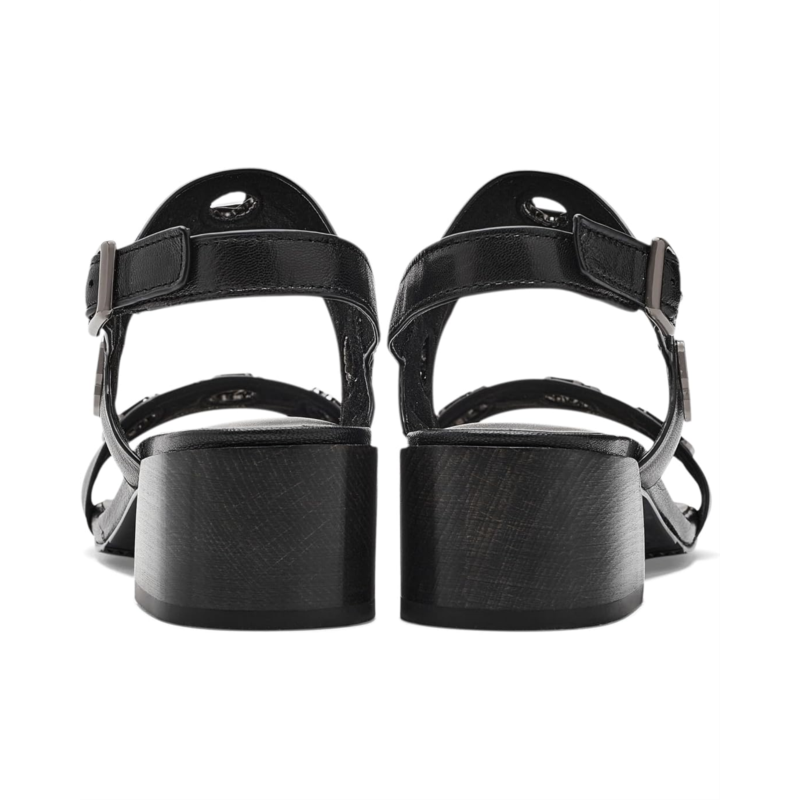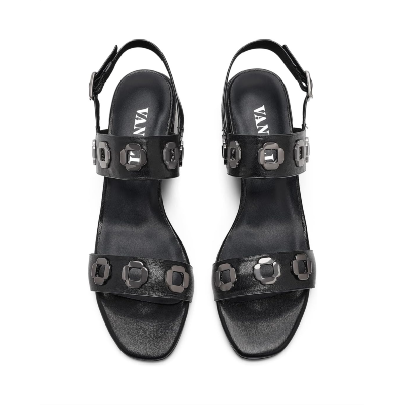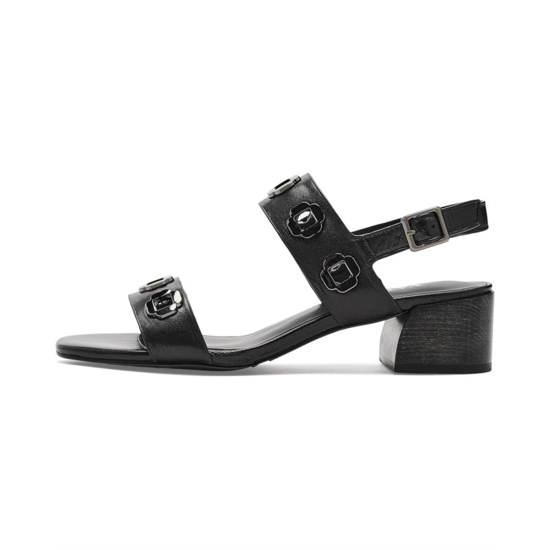 - The Vaneli Cris sandal features shiny hardware embellishments for a touch of sophistication. A block heel offers both style and stability. The look is completed with a buckle adjustable slingback strap, ensuring a secure fit while adding polished detail.