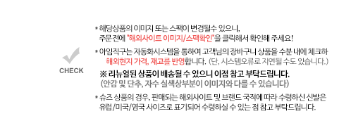 - 2025.8월 말부터 미국으로 반품 시 관세가 부과되어 반품비용이 크게 증가하였으니 구매 전 사이즈·색상·상품정보를 꼭 확인해주시길 권장드립니다.